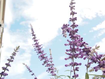 「サルビアレゥカンサ」が紫色の美しい花を咲かせています。台風の影響が無くなった秋の空に映えて見事ですよ。本館と中校舎の間にあるのですが,夏休み明けには花がなくく葉や茎ばかりが育っていたので雑草のように思っていたのですが,花に悪いことをしました。おわびにインターネットで調べたら「メキシコや中央アフリカ原産で8〜11月が開花時期」とありました。