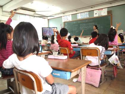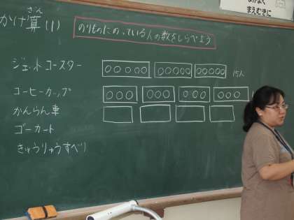 2年2組は算数の時間。「かけ算」で「のりものにのっている人の数をしらべよう」にチャレンジ。数図ブロックやデジタルTVの画面を参考にしながら頑張っていました。