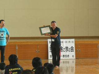 学校長のお礼のあいさつの後,便きょう会の会長から「ひとつ拾えば ひとつだけきれいになる」の額を頂きました。今日参加した子ども達は,とてもいい経験ができたのではないかと思います。この取組を通して感じたことが子ども達の心に響き,行動に変化が生まれれば嬉しいです。