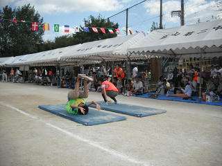 第3関門ドンゴロスをくぐりぬけ,第4関門マットで前転してゴールへ走り抜けます。