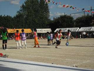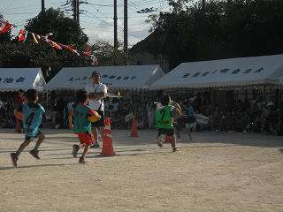 プログラムNO20『子どもドリブルリレー』1年生から順にボールを持って走ったり,ボールをドリブルしたりして上の学年にリレーしていきます。ドリブルがうまくできたチームが勝利への近道です。