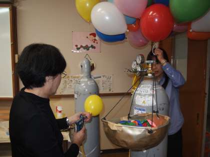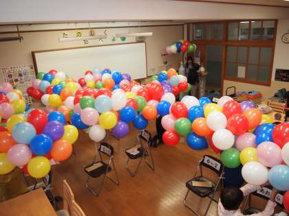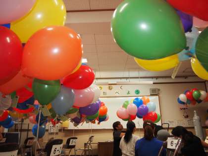 台風接近の中,早朝からPTA本部・40周年特別委員会・ボランティアの方々が,ランチルームで風船の準備をしてくださいました。当初は会議室の予定でしたが,ボンベを2階に上げるのは大変ということで急遽の変更でした。この時点でパラパラと雨が落ちかけていました。