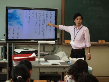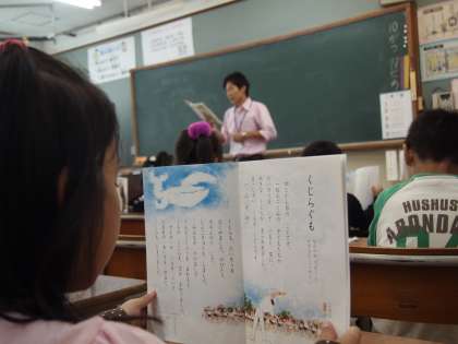 教育実習生さんが国語の授業をしていました。1年生の『くじらぐも』という教材です。音読が今日の授業のポイントなのですが,「声を出して本を読む時には,机の上に置かずに両手で持つようにしましょう。」とていねいに伝えていました。