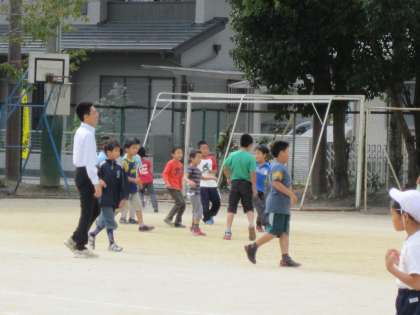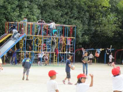 中間休みは,1年生は体育の後で担任や教育実習生と一緒に体育服のまま楽しく,ドッジボールをしていました。ほかの学年の子ども達も,ボール遊びや遊具遊びなどをして過ごしていました。