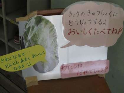 給食室前では,白菜のクイズがあり給食当番はしっかりとクイズを見ていました。