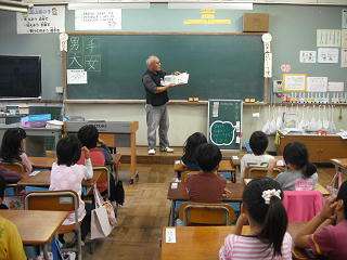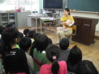 1年1組では森先生が「だじゃれっておもしろい」というテーマで『だじゃれどうぶつえん』『だじゃれレストラン』などの本について紹介しました。1年2組では生谷先生が『ちくわのわーさん』『うどんのうーやん』『こんぶのぶーさん』の三部作を紹介しました。