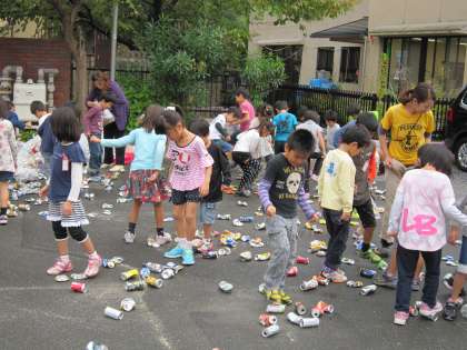 今日はアルミ缶回収の日でした。1年2組の子が担当してアルミ缶つぶしをしていました。こういう活動が,リサイクルについて考える機会となっています。