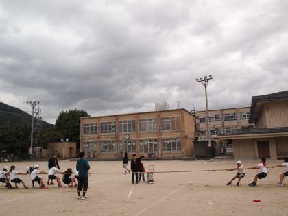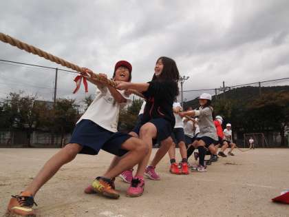 運動場から気合のこもった大声が聞こえてきました。「なんだろう?」と思ってみると6年生がつな引きをやっています。素早くカメラを持って直行しました。