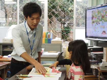 教育実習生の研究授業がありました。算数の「かたちづくり」の勉強です。子どもたちは手もとの色板を使って器用に「ふうしゃ」や「さかな」などを作っていきます。黒板に大きな色板を使ってお手本を作ってくれる子もいます。実習生の学生さんはこの4週間近くで学んだ成果をしっかり発揮してくれました。お疲れ様!