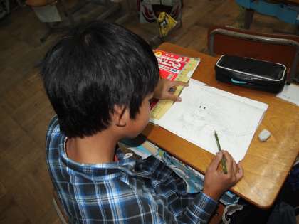 マンガを描いている子もいます。自由帳に自分の好きなキャラクターを描いて楽しむのも,こんな雨の日にはいいかもしれませんね。