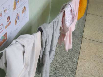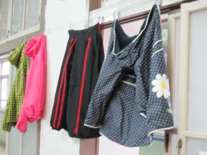 2年2組の前を通ると,せんたくものかと見間違うように服が干してありました。