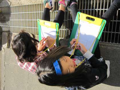 今日は,昼に見える月です。大渡り廊下のところから北西に見えるつきを観察し,記録ノートに書いていました。