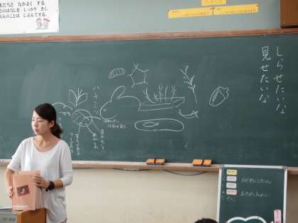 学校にいる生き物や学校にある物をお家の人に伝えよう…,1年生はみんな喜んで伝えたいことを文章にしようとしていました。