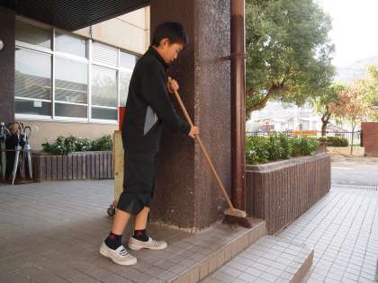 自問清掃の時間です。足ふきマットのごみを指で一つ一つつまんで取り除いている子がいました。「みつけ玉」を一生懸命磨いているようです。