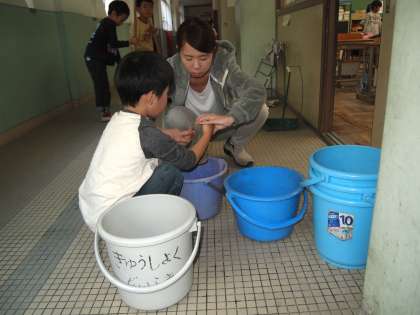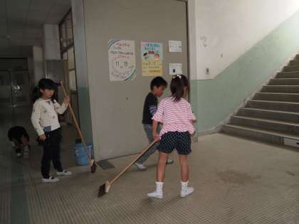 掃除のやり方は大切な指導事項です。ほうきのはき方や雑巾の絞り方など,基本的なことは繰り返し教えていきたいと思っています。自問清掃の時間中はしゃべれないので身振り手振りで教えているようです。