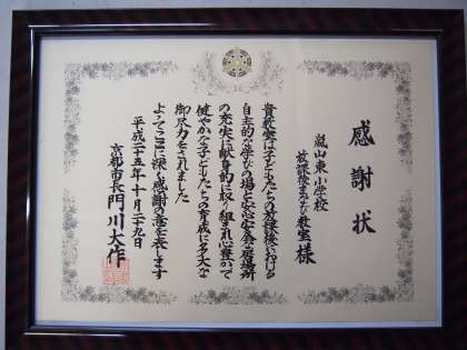 本校の放課後まなび教室が開講して5年になります。京都市教育委員会よりスタッフの方々に感謝状をいただきました。今までいろいろとありがとうございました。これからも子どもたちがたくさんお世話になります。どうぞよろしくお願いします。