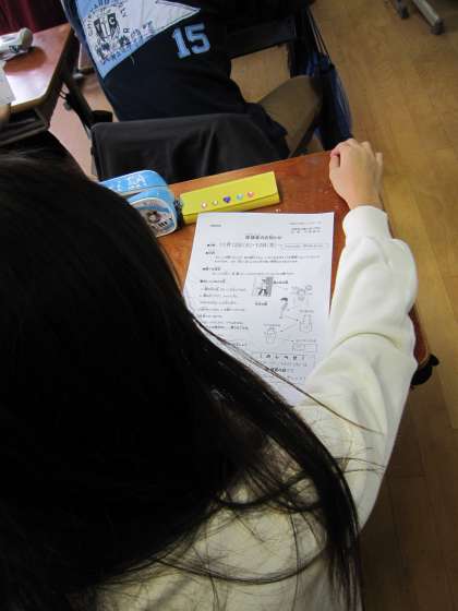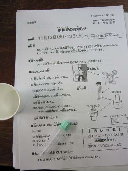 6年1組では,尿検査に必要なものを配布していました。尿検査によって,自分の体の状態を調べます。