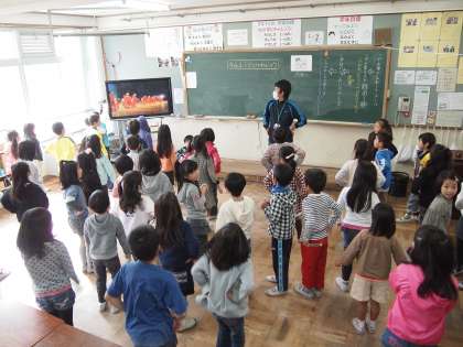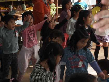 2年生は合同で教室で学芸会の踊りを踊っていました。ビデオを見ながらでしたが,見よう見まねで楽しそうに踊っていましたよ。