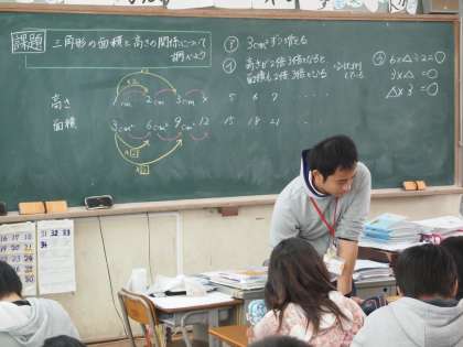 5年1組は算数で「三角形の高さと面積の関係を調べよう」です。両者の間にはどんな規則性があるのでしょうか?