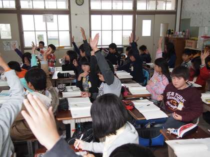 5年2組は国語「大造じいさんとガン」。ガンの頭領として威厳をもった残雪を檻から放った時の大造じいさんの心情を考えました。