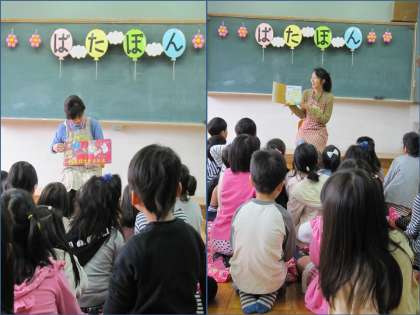 今日は,ぱたぽんさんの読み聞かせの日です。中間休みになると,子ども達が集まってきました。