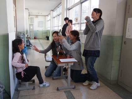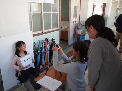 実行員会のお母さんたちが数名で「はい,笑って」「そうそう,その笑顔でね〜」などといい雰囲気を作ってくださっています。はにかんだり爆笑したり…。すごくいい感じで撮影が進んでいました。子どもたちは「でき上がりが楽しみ!」「早〜く見たい!」と盛り上がっていました。