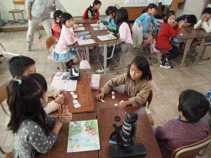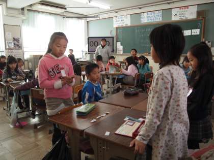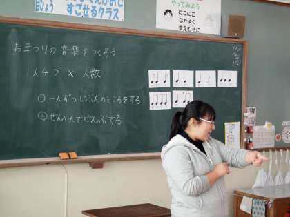 2年2組は音楽の時間。『お祭りの音楽を作ろう』とリズムうちの練習をグループでやっていました。