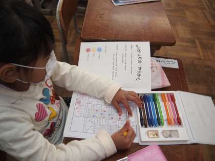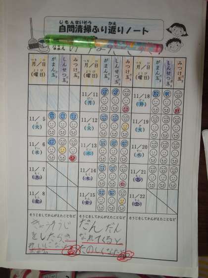 1年生の教室をのぞいてみました。ぴかその終了後,ふり返りノートに記録していました。「だんだんなれてくるとたのしくなってきた」と書かれています。こちらも楽しく読ませてもらいました。