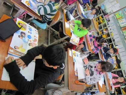 4年2組では,「ペットボトルにせんをして,お湯につけるとどうなるかな」という課題について,予想を立てていました。