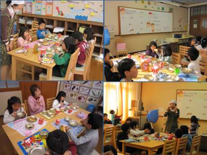 正しいかみ方を覚えようというテーマで,お話を聞きました。このお話の中で,正しくかんでいると,おいしい音がすると聞いた1年生は,給食のニンジンやラーメンを食べるとき,音を聞こうと耳を押さえていました。どんな音かと尋ねると,「にんじんはチュアチュア」「ラーメンはチュルチュル」「パンはモグモグ」「牛乳はプチュプチュ」という音がしたと教えてくれました。
