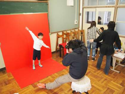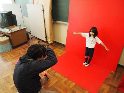 創立40周年実行委員会の方々が先日からずっと写真撮影に来ていただいています。 40周年記念誌に載せる児童写真ですが,今日は最終日で1年生です。赤いバックに両腕を広げたポーズをとっています。どうしてこんな恰好をしているのかは…でき上がりをお楽しみに。それにしてもみんな本当に楽しそう!スタッフのお母さん方がいろんな声かけをしてくださっているからですが,子ども以上に楽しそうです。