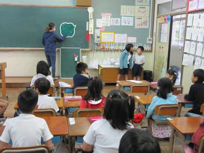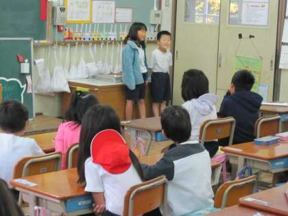 教室に行くと静かに,前にいる二人を見つめている子ども達