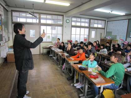 担任の持つ絵カードを見ながら,「A」「B」・・・・・や「eraser」などをみんなで言う元気な声でした。