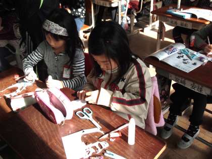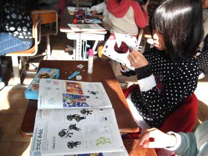 2年1組は図工で紙版画の練習をしていました。入門という感じで,顔の輪郭の上に目や鼻などのパーツを貼り付け,その上に紙を置き鉛筆でこすって浮き上がった感じでイメージするというものです。