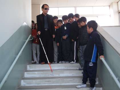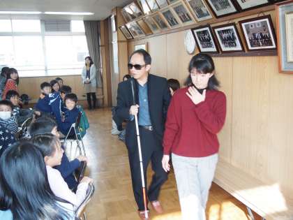 「お金のお札,区別が難しいでしょう?」「大きさが少しずつ違うんだよ」「目の見えない人が困っていたら…,『何かお手伝いしましょうか?』と聞いてあげてね」「手引きはひじを持たせてもらって歩いてほしいのです」