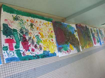 5時間目に1年生の教室の前を通ると,「いろいろペッタン」でできた作品を乾かしていました。