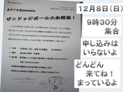 おやじの会主催のザ★ドッジボール大会が,12月8日(日)9時30分集合で行われます。事前申し込みはいりません。嵐山東小学校の児童はだれでも参加できます。