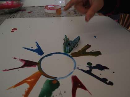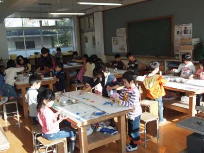1年2組は図工室にいました。「いろいろぺったん」ということで,洗濯ばさみや紙コップなど,身の回りの物を使って絵具をつけてスタンプのようにおしていきます。実に意外な形が現れてびっくりすることがあるようですね。