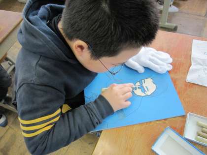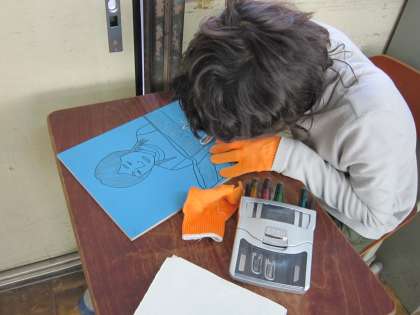 彫刻刀をもたない手には,安全のため手袋をつけて,彫っています。