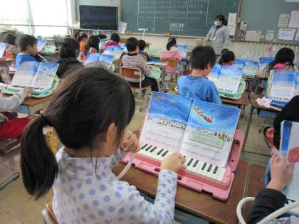 今日の2組では,階名をうつした後,鍵盤ハーモニカでの演奏にチャレンジしていました。
