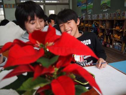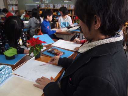 5年生は交換授業をしていました。1組はポインセチアを描いています。うまく描く秘訣を小林先生に尋ねると「葉っぱ同士の外側のラインの関係を意識して描くこと。そうすれば全体のバランスがとれるようになります」だそうです。