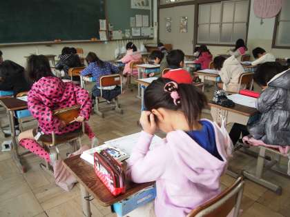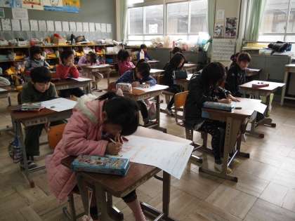 2年2組は算数のテストの最中。みんなとても集中していました。