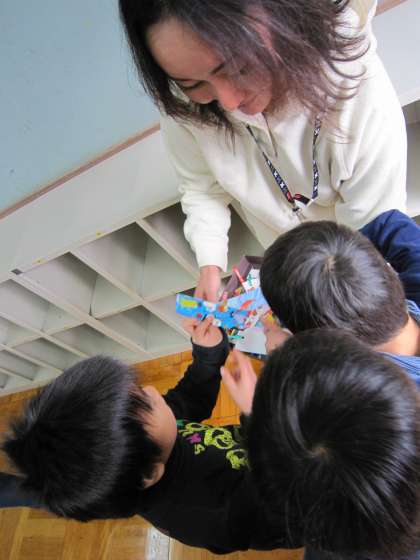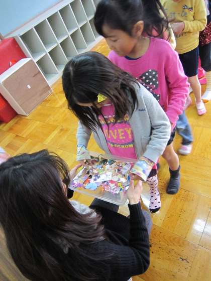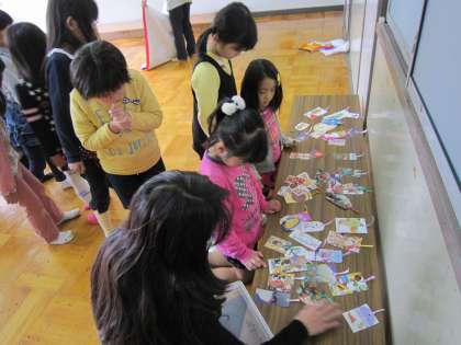 読み聞かせの後,ぱたぽんさんから本のしおりのプレゼントがありました。