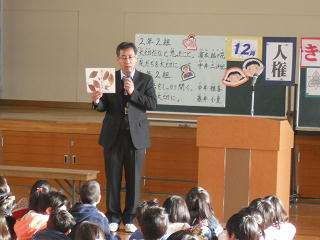 12月のきらめきタイムの前に,教頭先生から地域のみまもり隊の方からいただいた葉っぱのオブジェを紹介していただきました。