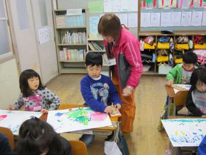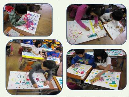 1年生は,先日いろいろなものを使って画用紙にスタンピングしました。今日は,先日スタンピングした画用紙に描き加えようとしていました。