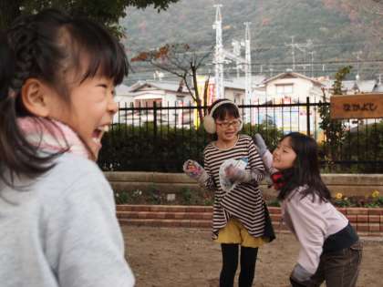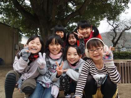 中間休み,クスノキの周りでとても楽しそうな子どもたちがいました。鬼ごっこをしていたのですが,あまりに楽しそうだったので集合写真まで撮らせてもらいました。