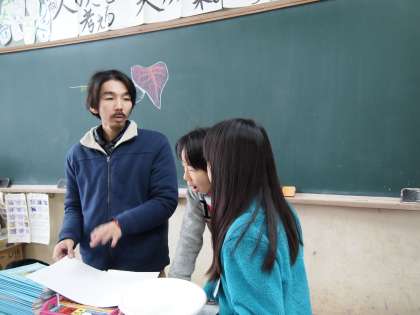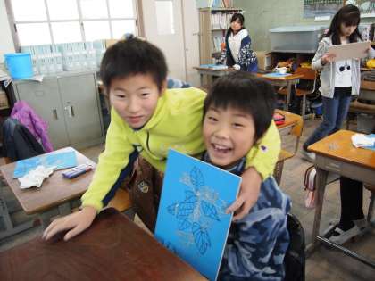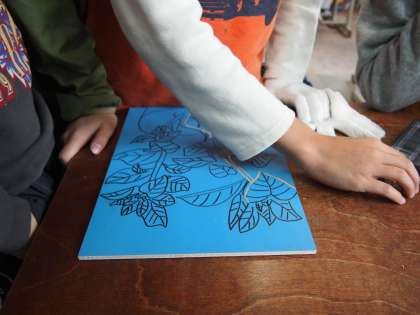 5年1組は交換授業で図工の木版画にチャレンジ。今日は彫り始めたところです。