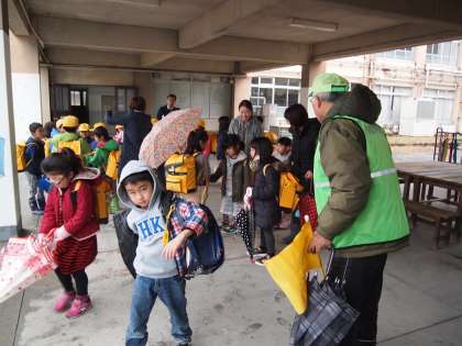1年生は毎日見守り隊の方々のお世話になっています。今日も朝からずっと雨でしたが見守り隊の方々は一生懸命に子ども達を見守ってくださっています。毎日本当にお疲れ様です。