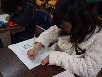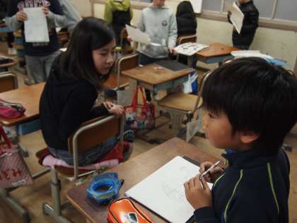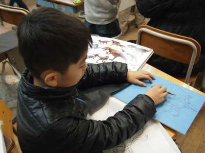 4年1組も版画の時間。こちらは図鑑や写真を使ってモノ描きにトライ。白黒のバランスに気を使いながら取り組んでいました。