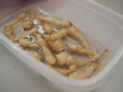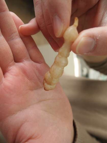 これは「千代呂き(ちょろぎ)」という京野菜です。重箱の必須アイテムですが,その色や形からマカロニやカブトムシの幼虫に間違えられてしまうことが多いようです。小かぶらのような大根だそうで地下茎の先が大きくなってこのような形になっているそうです。